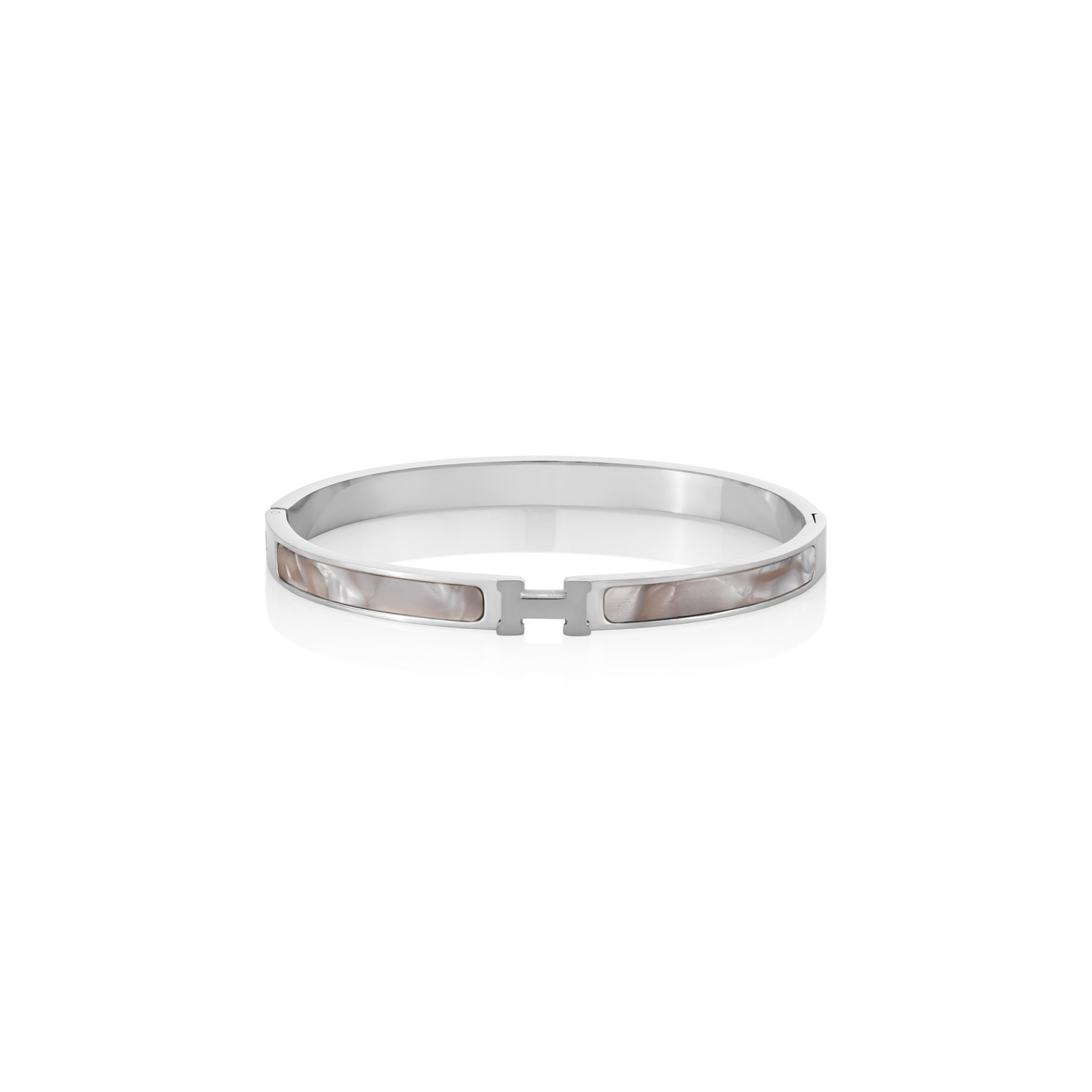 צמיד קשיח בגוון כסף עם פנינה וסיומת H עובי 5 מ”מ