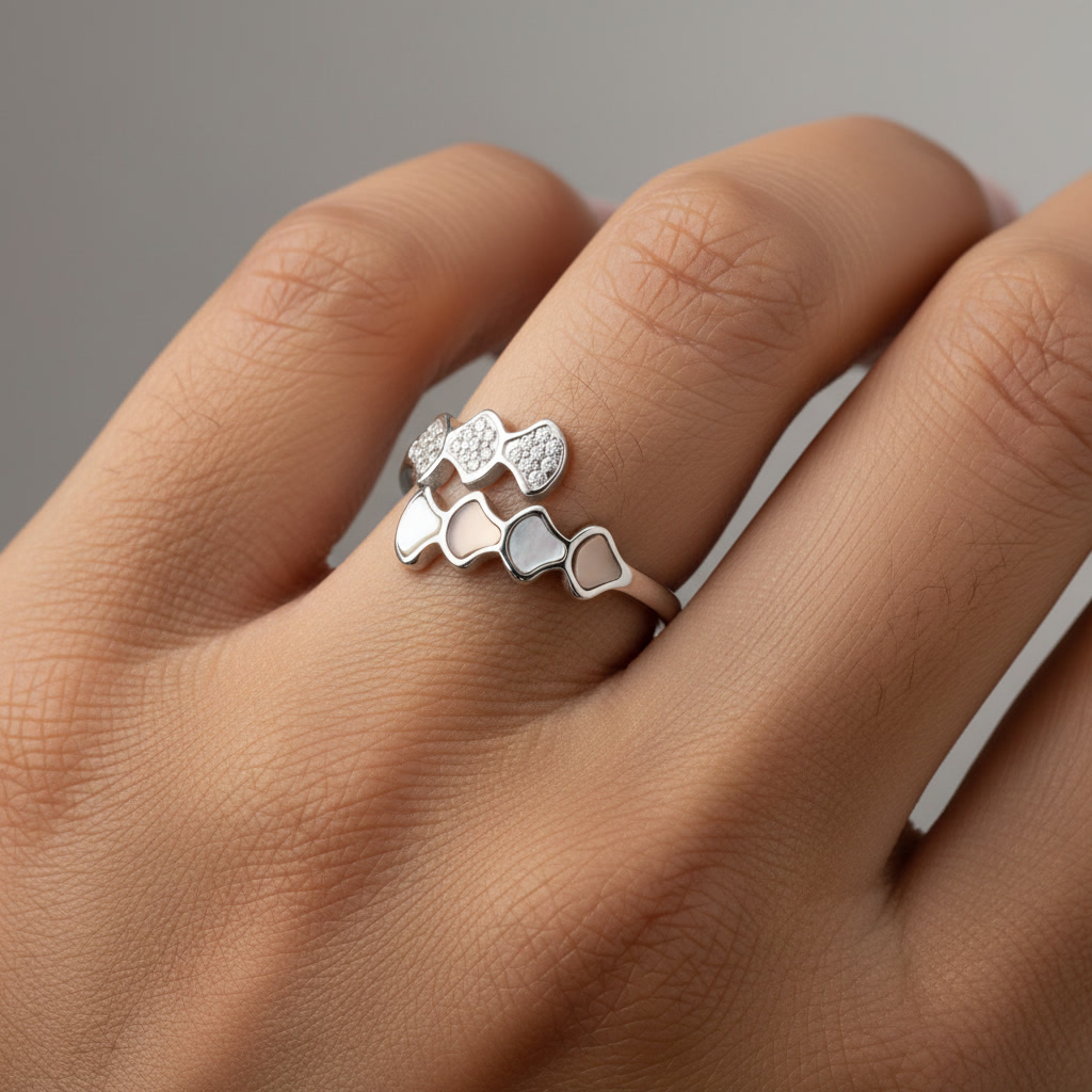 טבעת מעוצבת בגוון כסוף אלגנטי, עם שורת לבבות עדינים המקשטת את החלק העליון. חלק מהלבבות משובצים בזירקונים נוצצים המוסיפים ברק ייחודי, וחלקם מצופים בגוונים עדינים היוצרים שילוב מודרני ורומנטי. טבעת זו מעניקה מראה רך ומלא סטייל