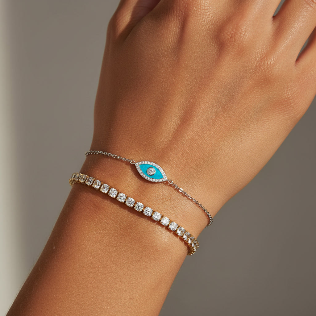 צמיד טניס כסף 925 בציפוי זהב עם שורת אבני קריסטל שקופות ומבריקות.
